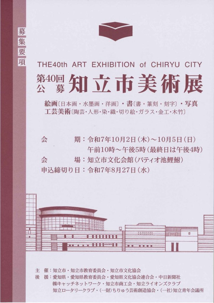 2025年8月19日 / 最終更新日時 : 2025年8月19日 事務局 文協だより 第40回公募 知立市美術展 出品申込が本日より始まりました! 第40回公募 知立市美術展 出品申込の受付が本日令和7年8月19日㈫より始まりました。 8月27日㈬の16時まで文化協会事務局にて受付しています。 (郵送の場合当日消印有効) たくさんの応募を心よりお待ちしています‼ 関連 コメントを残す コメントをキャンセルメールアドレスが公開されることはありません。 ※ が付いている欄は必須項目ですコメント ※ 名前 ※ メール ※ サイト 次回のコメントで使用するためブラウザーに自分の名前、メールアドレス、サイトを保存する。 新しいコメントをメールで通知 新しい投稿をメールで受け取る Δ